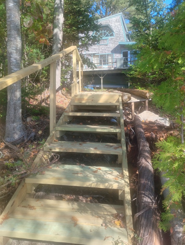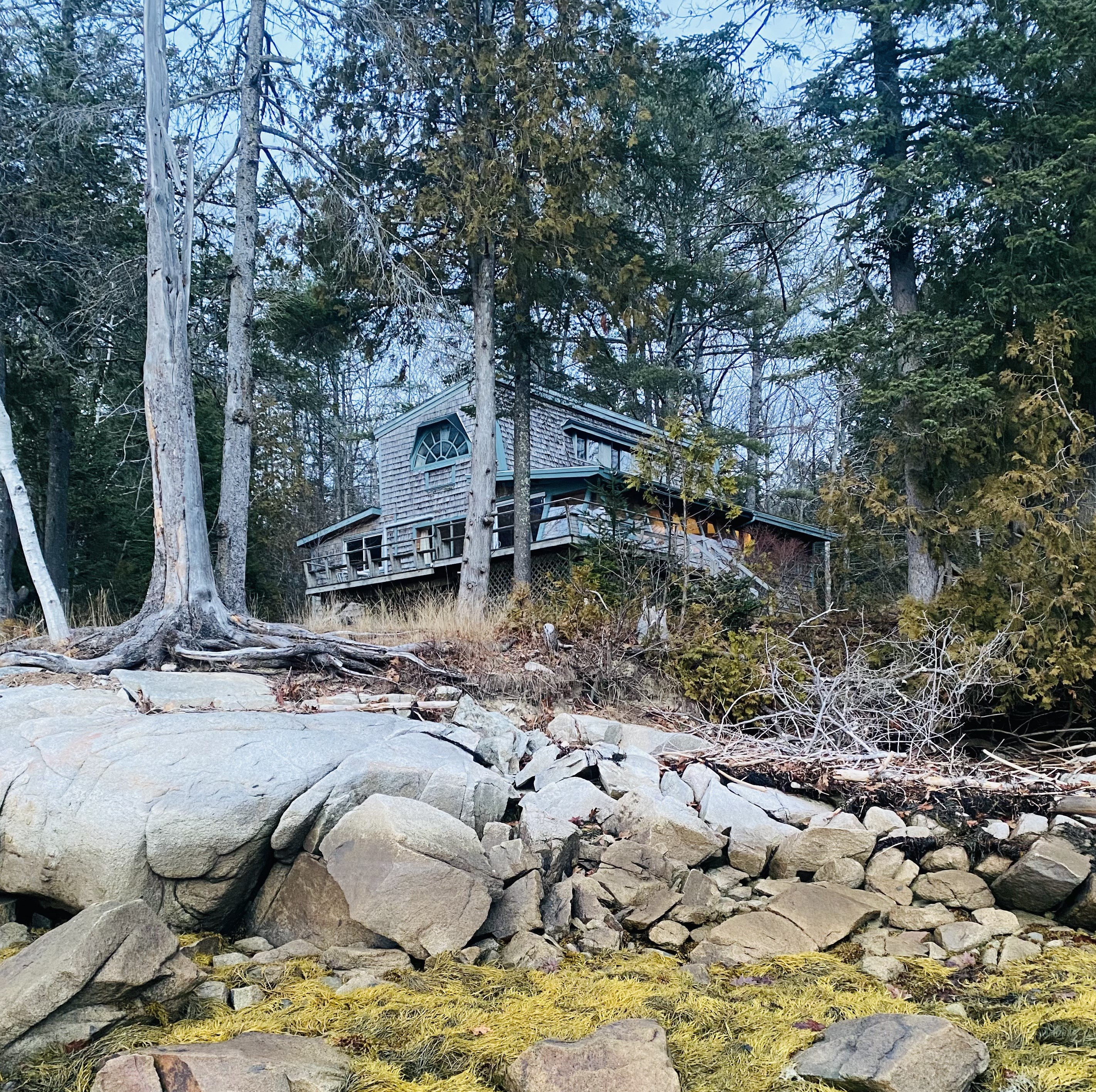 The house is nestled in the woods in an area that once was the site of granite quarries. On the sunny west side it faces a large bay which connects though a tidal straight to the larger Frenchmens Bay.